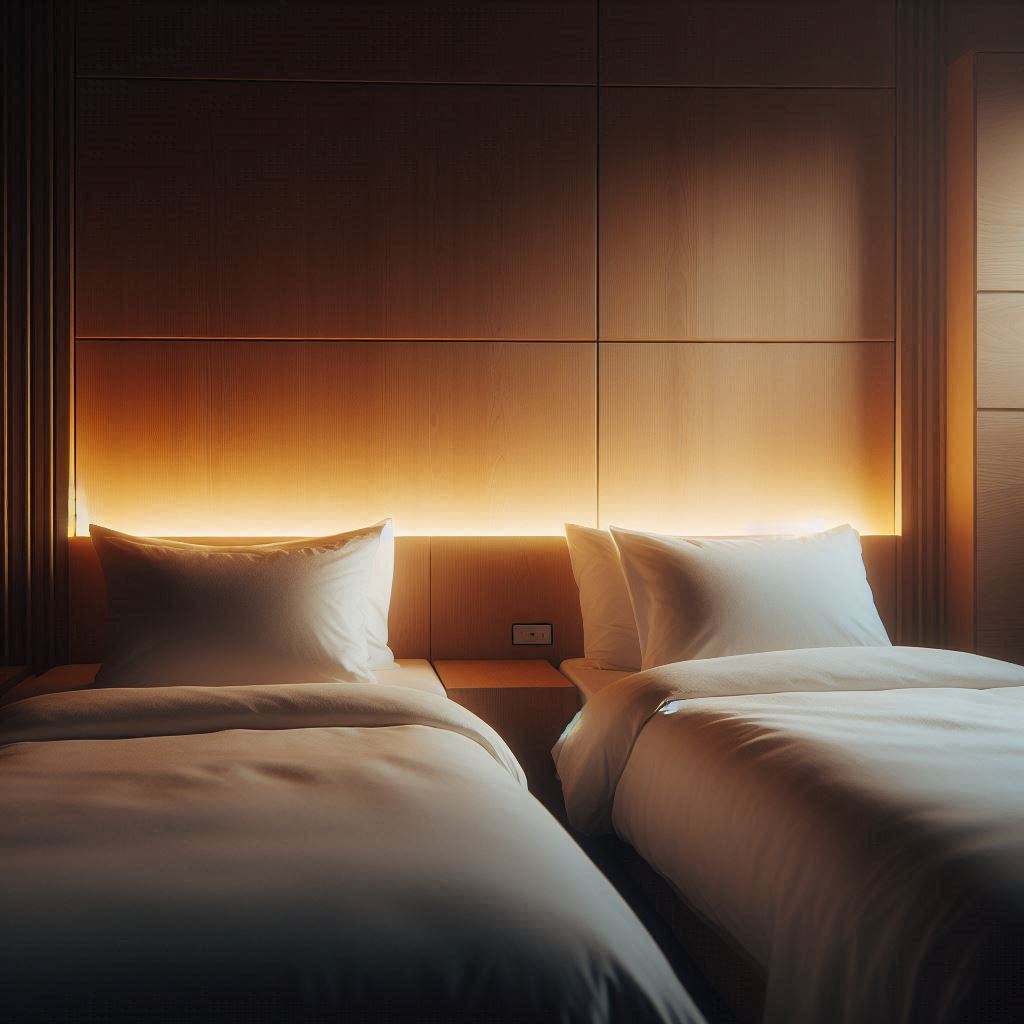 입구에서 객실로 이어지는 복도는 조도가 일정하게 유지되어 있어 밤에도 시야 확보가 편했습니다. 객실 문을 열면 은은한 색감의 벽지와 단정하게 밝힌 간접등이 맞아 주어 즉시 안정된 분위기가 느껴졌습니다. 온도는 과하게 높거나 차갑지 않게 조절되어 있었고, 에어컨 작동음이 크지 않아 실내가 조용하게 유지되었습니다. 침구는 모서리 라인이 흐트러짐 없이 잡혀 있었고 베개는 눕는 순간 머리가 자연스레 놓이는 형태라 부담이 없었습니다. 테이블 위에는 비대면 안내 QR코드와 리모컨들이 한쪽에 정리되어 있어 처음 방문해도 동선을 고민할 필요가 없습니다. 전체적으로 군더더기 없이 구성된 느낌이 강했습니다.